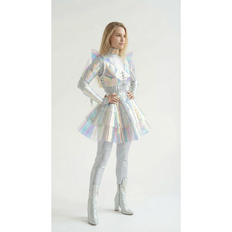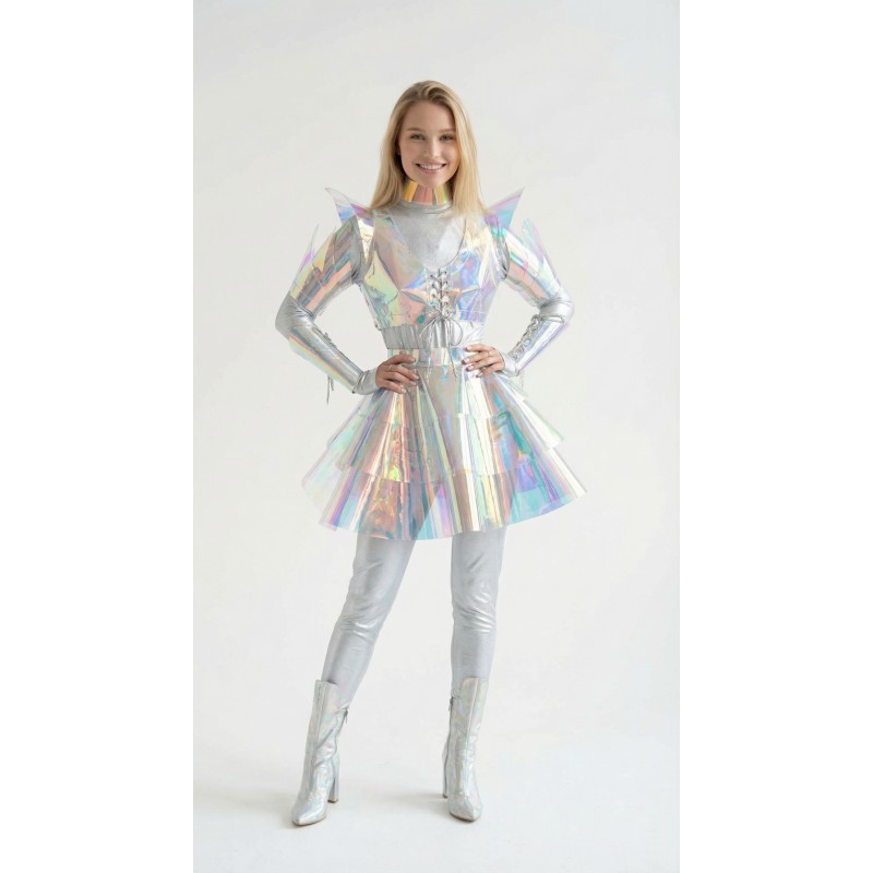 Голографический костюм для аниматора - эффектный футуристичный наряд, который привлечёт внимание на любом мероприятии: от детских праздников до тематических шоу. Создаёт образ инопланетянки или героини научно-фантастического фильма.