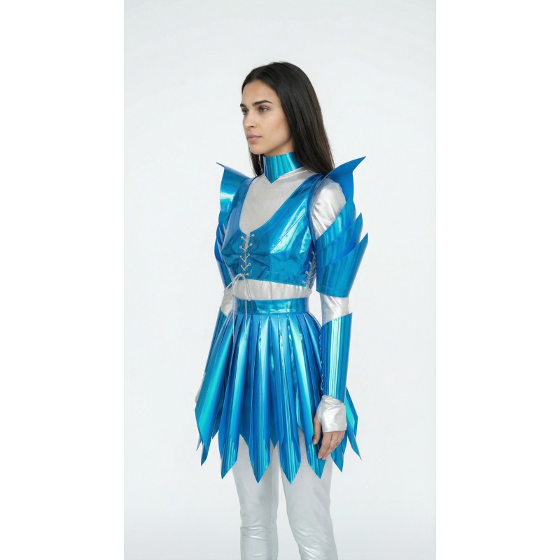 - Топ-жилетка с регулировкой спереди из голографической пленки с переливами, дополнен выразительными «крыльями» на плечах, а так же съемными налокотниками, высокими манжетами и чокером на шею